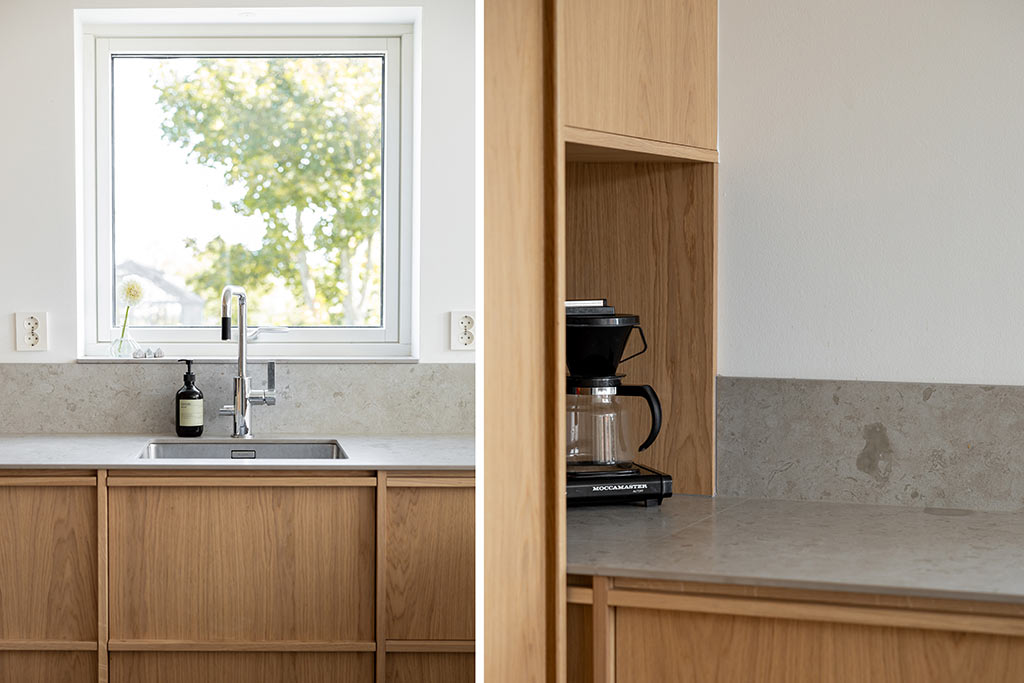 Sandra har varit byggets projektledare och utöver utformning och materialval har hon hanterat leveranser och skött många dialoger. Fredrik har ansvarat för själva byggnationen och lagt många timmar på plats. Fredrik har tagit besluten kring det byggnadstekniska och Sandra om det estetiska, och de har varit överens under hela processen. Endast en gång behövde Fredrik lämna in veto. Att sätta in en kamin i huset var inte okej. “Det blir ju 40 grader i huset med en kamin så det röstade jag ner, annars brukar det bli bra när Sandra väljer”, säger Fredrik glatt.