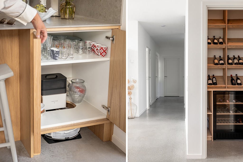 Robotdammsugaren har fått en egen, specialbyggd plats under bänkskåpet i köket. Hyllorna till vinförvaringen i köket har Sandras pappa byggt.