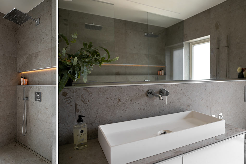 Badrummet på entréplan har en stor och rymlig dusch med två takduschar, utformad så att hela familjen ska få plats. Utgången från altanen gör det enkelt för barnen att springa direkt in i badrummet och duscha av sig både gräs och grus efter lek i trädgården. Badrummet har en utgång direkt till altanen där familjen planerat för en badtunna framöver.