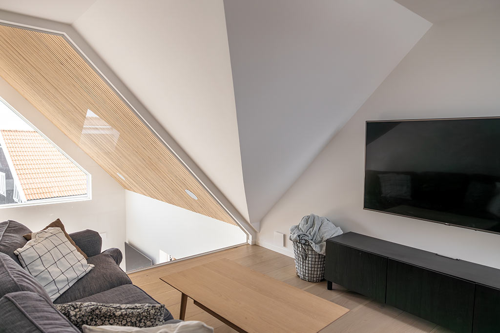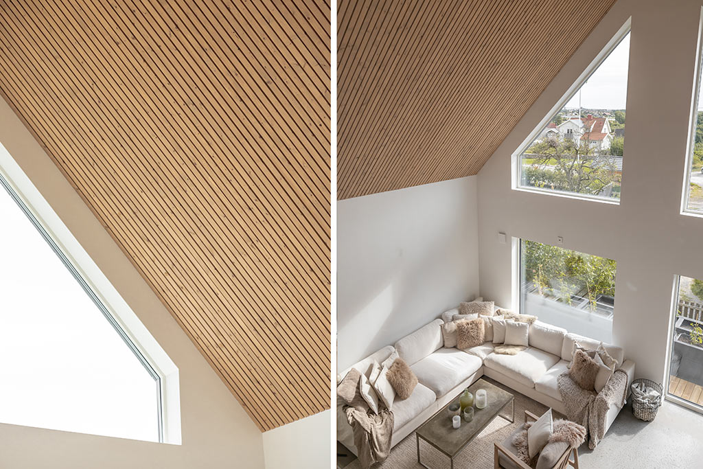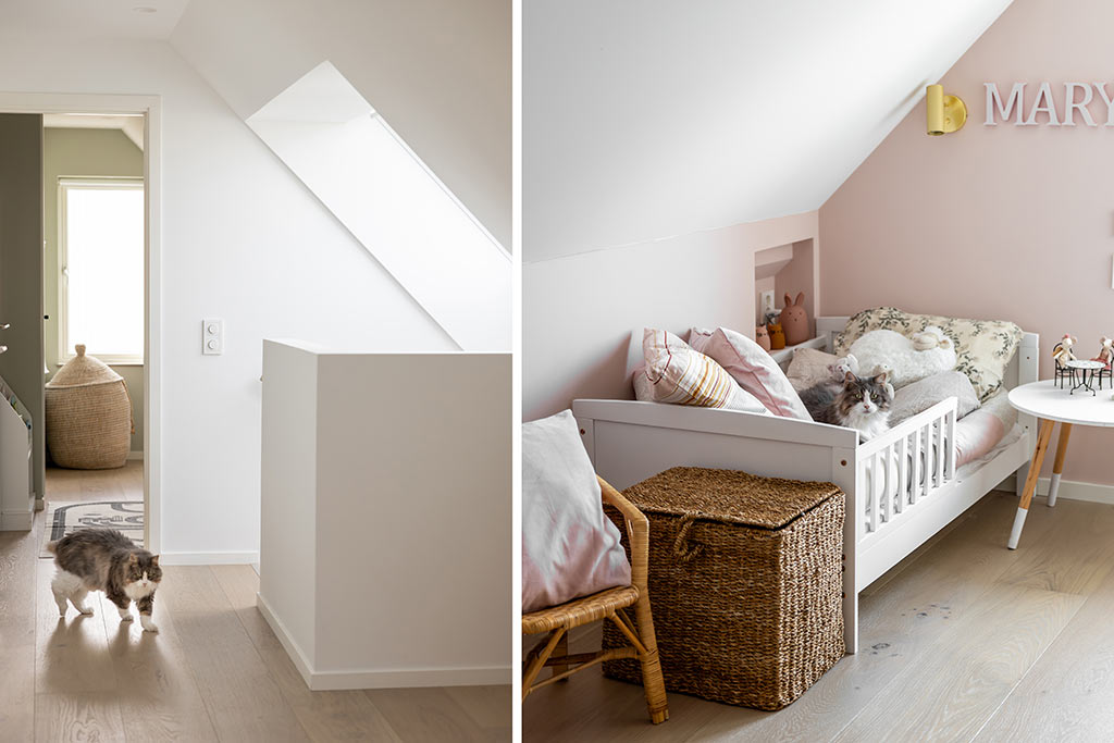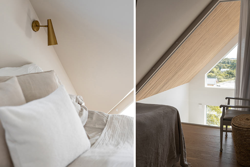 Alla rum på övervåningen har snedtak och i husets mittenparti lyses rummet vackert upp av flera takfönster.
