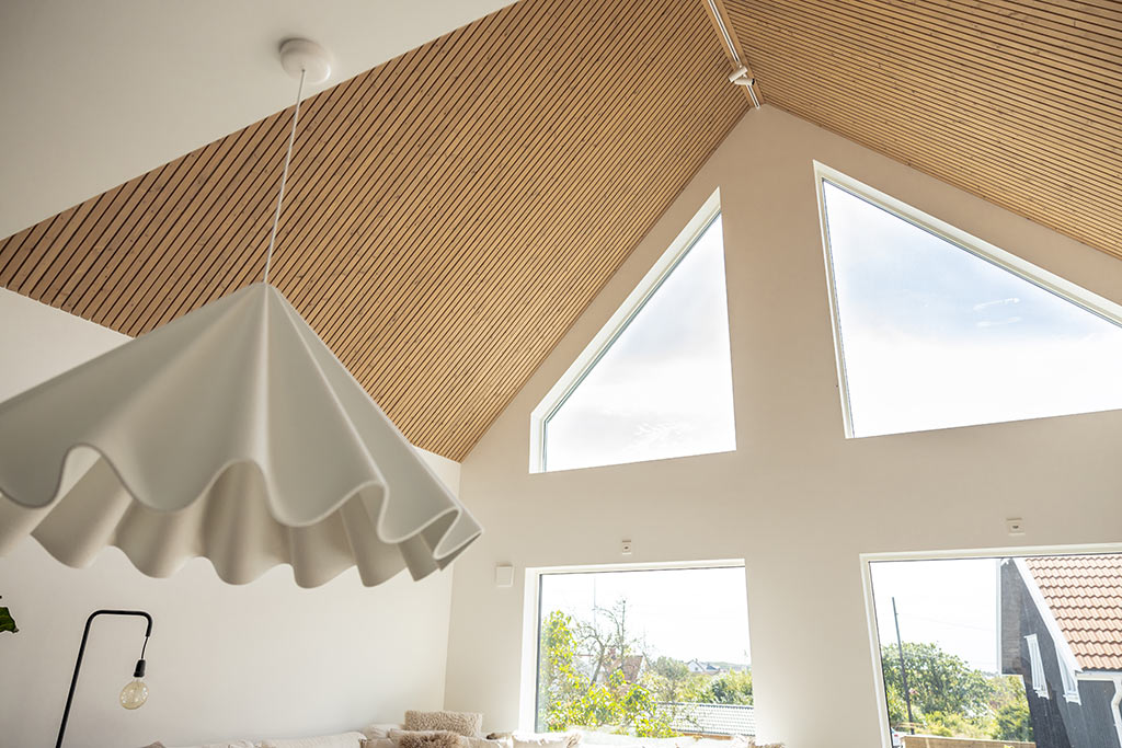 I det 186 kvm stora huset finns många detaljer där familjen lagt ner mycket energi. Innertaket i vardagsrummet klätt i träribbor är en sådan detalj. De akustikpaneler som Sandra ville montera i taket var för korta. För att slippa skarva längderna valde de istället att köpa 5 meter långa ribbor i furu och montera varje ribba separat, ovanpå ett lager av skumgummi och markduk. Dessutom lade Sandra en och en halv vecka på att betsa alla ribbor i samma nyans som köket. “Det gick ju inte att pensla på betsen heller, utan den skulle ju masseras in” säger Sandra och skrattar.