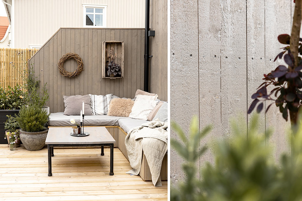 I ett hörn av altanen har Sandra byggt en mysig soffhörna där hela familjen gärna hänger.