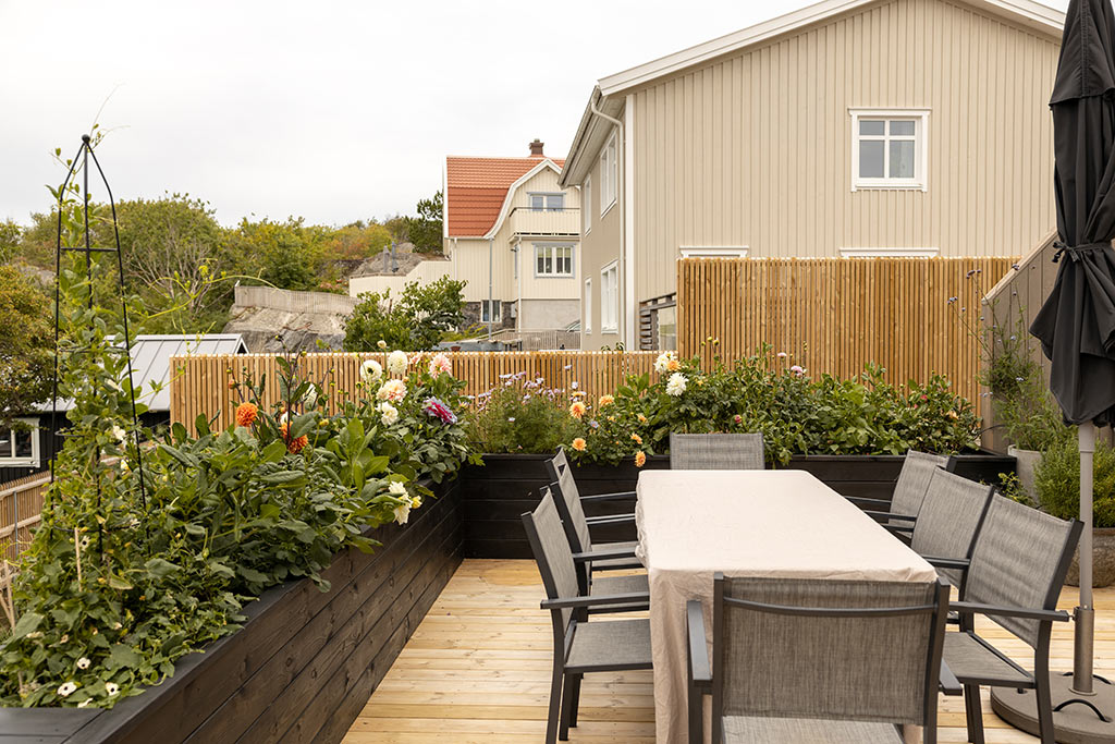 Huset är utformat i vinkel, och i själva vinkeln har familjen efter inflytt hunnit bygga en härlig utemiljö med altan. Här finns gott om plats för Sandras stora intresse för odling och blommor. Odlingslådorna med prunkande dahlior är både färgsprakande och skapar ett insynsskydd vid utemöblerna.