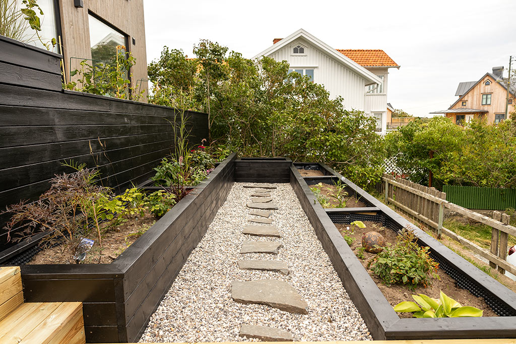 “Något som vi hade med oss från första gången vi byggde hus var att tänka på trädgården redan från början. Framförallt för att få med murar, staket och altan på bygglovet direkt och slippa söka nytt bygglov för det senare. Eftersom att trädgården är viktig för mig tog vi tidigt hjälp av en trädgårdsarkitekt. Hon hjälpte oss bland annat med placering av altan och odlingsbäddar, och gjorde skisser över vår tomt. Vi har kommit ganska långt med trädgården men vi har fortfarande mycket kvar att slutföra här ute” säger Sandra.