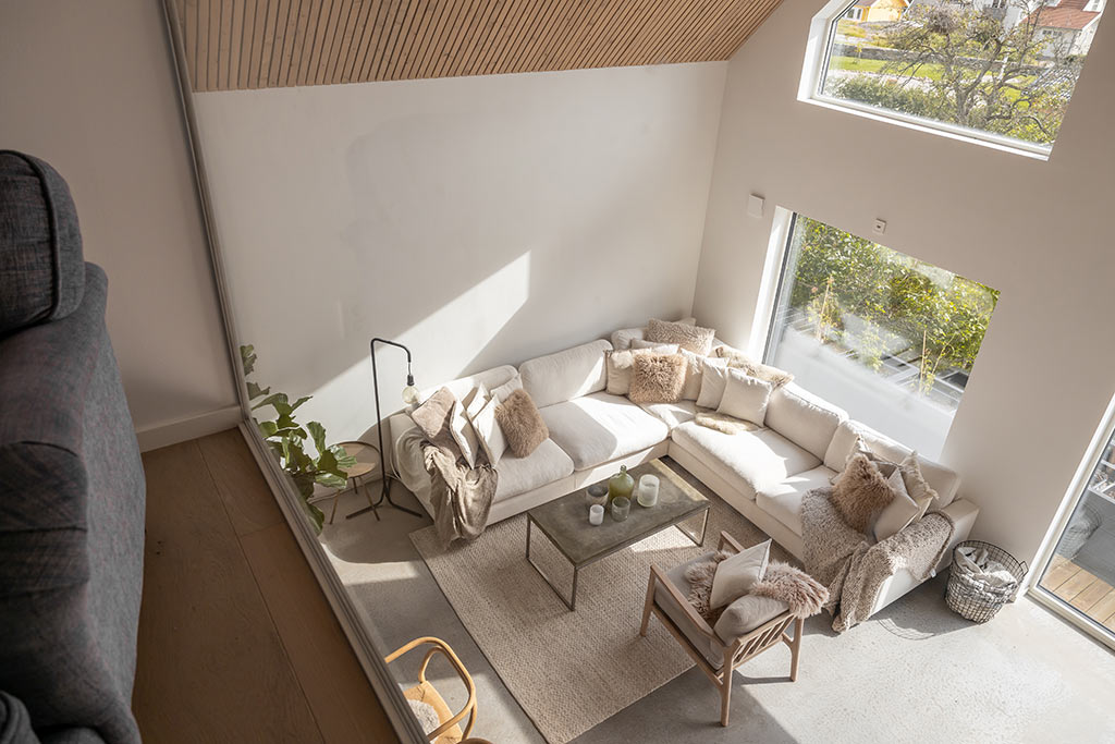 Husets umgängesytor har ett fantastiskt ljusinsläpp och en rymlig atmosfär tack vare takhöjden på 6,5 meter.