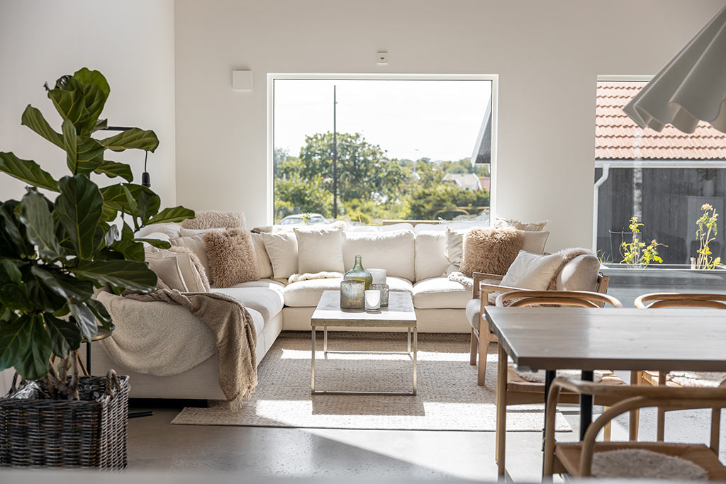 Hela idén till det nya huset grundar sig i en bild som Sandra hittade på Pinterest. Huset hon hittat inspiration ifrån hade en planlösning med öppet upp till nock i vardagsrummet och till andra våningen där man kunde titta ner från rummen till det öppna vardagsrummet. Sandra började spinna vidare utifrån denna bild och resultatet blev det magnifika vardagsrummet med 6,5 meter i takhöjd, och två stora invändiga fönster mellan gemensamhetsytorna och ovanvåningen. De stora fönsterpartierna lyftes in i huset tidigt i processen eftersom de var för stora för att gå in genom någon dörr när huset väl var färdigt.