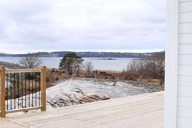 Från början var det tänkt att huset skulle byggas i suterräng, för mot havet i väster möter huset en bergvägg. Tillslut kom paret, tillsammans med Alingsås Huspaket, fram till att det blir både billigare och smidigare att spränga bort lagom mycket av berget och istället bygga ett tvåplanshus på platsen. Av den anledningen finns det inga fönster i västlig riktning på bottenvåningen eftersom berget ligger bara en liten bit från husväggen. Det gör dock att överraskningen blir ännu större när man kommer upp på övervåningen och möts av den fantastiska utsikten.