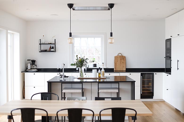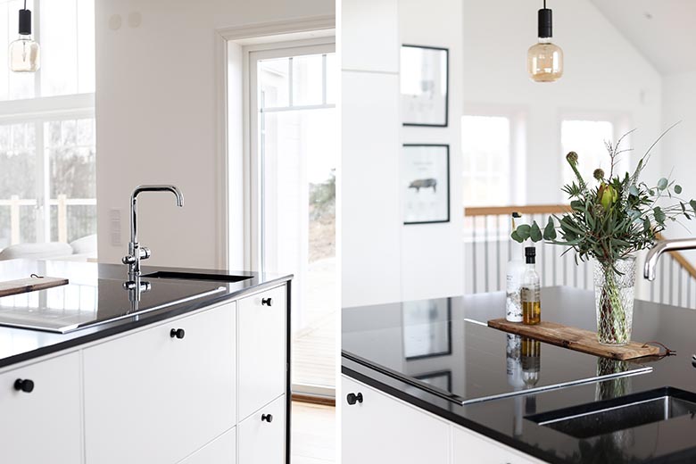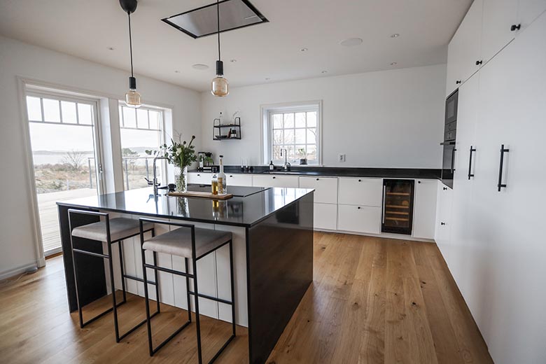 I köket går färgerna i svart och vitt med en stilren inbyggnadsfläkt i taket som går att styra via Google Home.