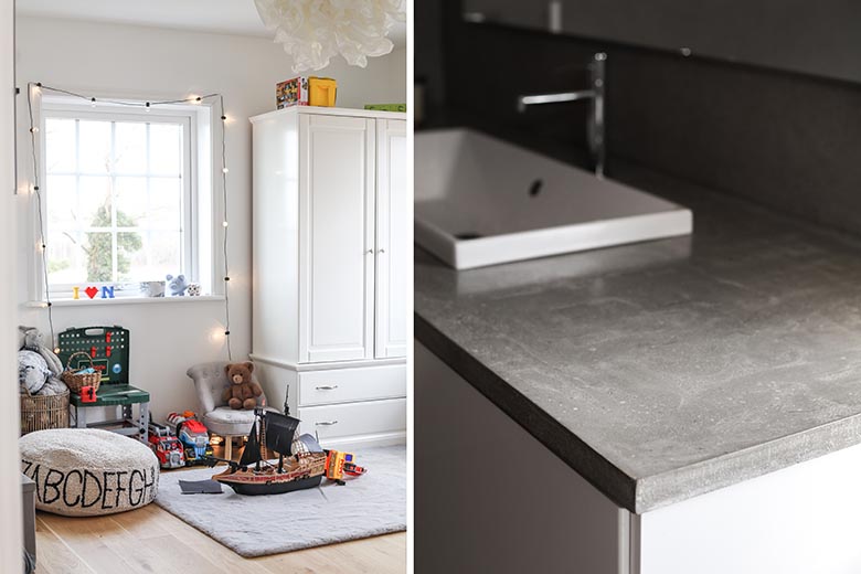 Det stora badrummet på övervåningen är det som Carolina ritat om flest gånger. Nu har både toalett, kommod, dusch och badkar fått en given plats. Pricken över i är den vackra bänkskiva som Patrick gjutit själv. Trappan var en annan sak som Carolina brottades med, tills hon upptäckte att flera hus har trappan placerad längre in i huset, och inte precis vid entrén som hon först tänkte. Något som hon valde att själv inte ta beslut om är fönstrens placering. Paret litade till fullo på Alingsås Huspakets konstruktörer och är glada över den hjälpen de fick.