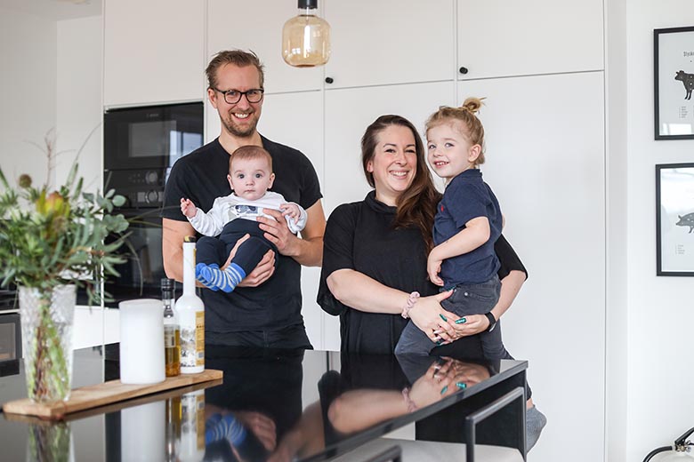 Köket och dörrhandtagen är det enda som familjen inte köpt via Alingsås Huspaket. Paret har själva byggt ihop köket med hjälp av färdiga stommar, och med en täckskiva mellan varje stomme har de skapat känslan av ett platsbyggt kök. Tillsammans med unika knoppar och handtag samt en bänkskiva i kompositsten är det ingen som kan ana att köket kommer från IKEA. Notera den smarta förvaringen som gömmer sig innanför barstolarna, gjord av två överskåp.