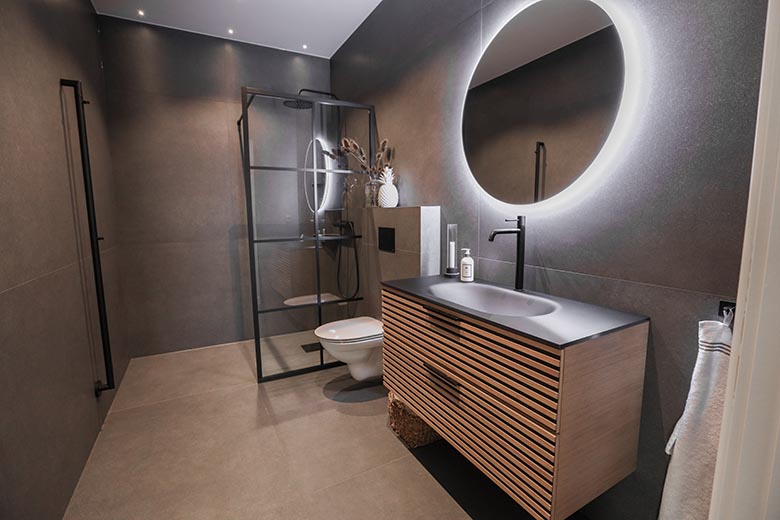 Kakelplattorna på väggar och golv i båda badrummen är 120 x 120 cm och sattes av Kakelbröderna AB.