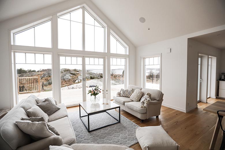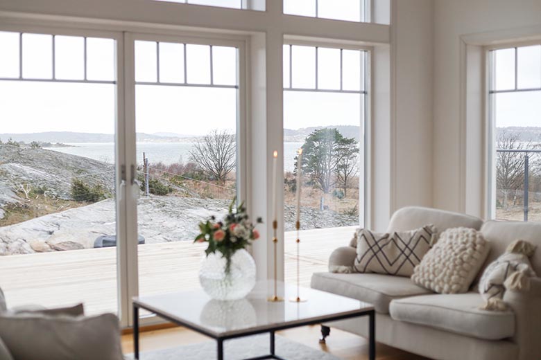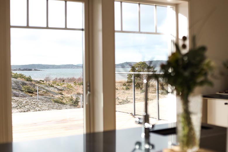 Både kök och vardagsrum har stora fönsterpartier som bjuder på magisk utsikt över Hakefjorden.
