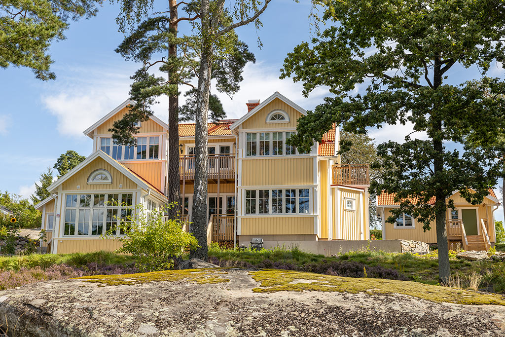 Den otroligt vackra villan som målats i en gul nyans med vita knutar stod klar i mars 2023. Det var under våren 2021 som paret köpte tomten och att ha gått igenom ansökan om strandskyddsdispens, bygglovsansökan, materialval och utformning av huset samt byggnation på bara två år är kort tid.