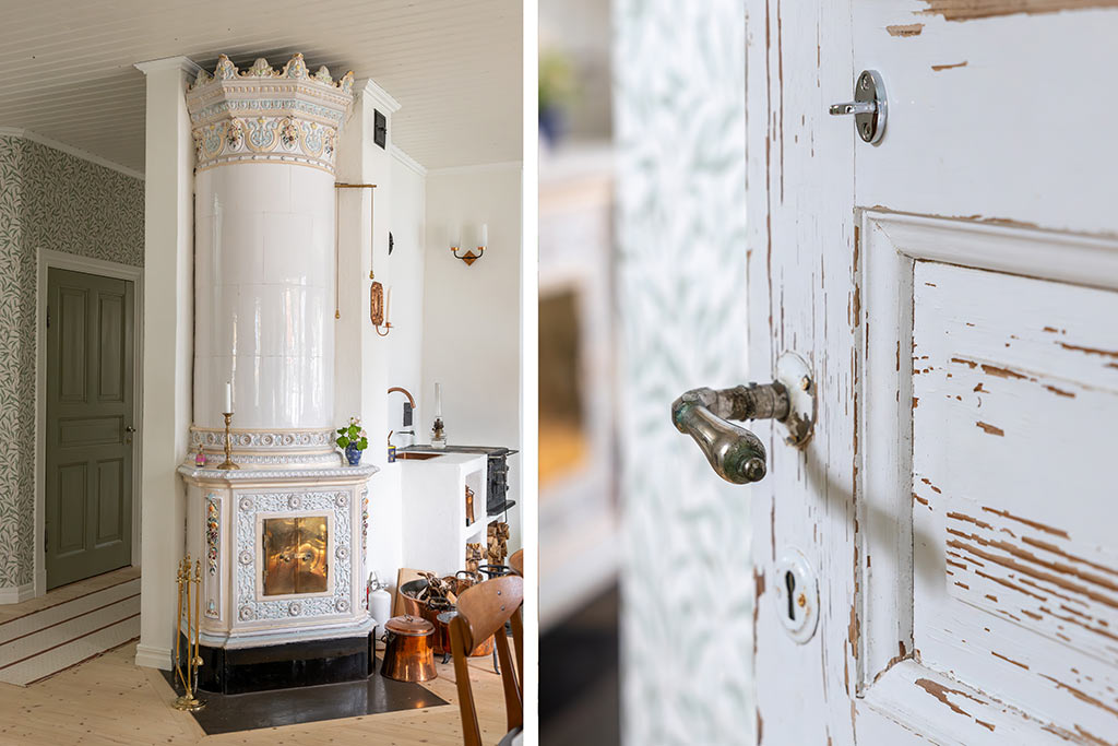 “Det är Simon på Alingsås Huspaket som har ritat vårt hus. Han utgick från ett hus som de kallar för Villa Klinten, men när vi hade kommit med alla våra önskemål och ändringar så slutade det med att Simon hade ritat om alltihop”, säger Kaisa glatt och fortsätter. “Det viktigaste för mig var att ha ett orangeri och ett skafferi, och att få plats med den här kakelugnen som är bevarad från slutet av 1800-talet. Vi har verkligen fått in allt vi önskade här.”
