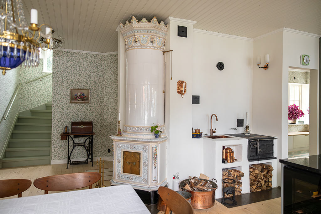 Gamla vedspisar är inte längre godkända att installera, därför är vedspisen i köket en nyproducerad version.
