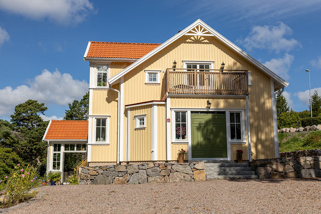 Det gula huset med vita knutar pryds av en ytterdörr i en grön kulör. På taket ligger tvåkupigt lertegel.