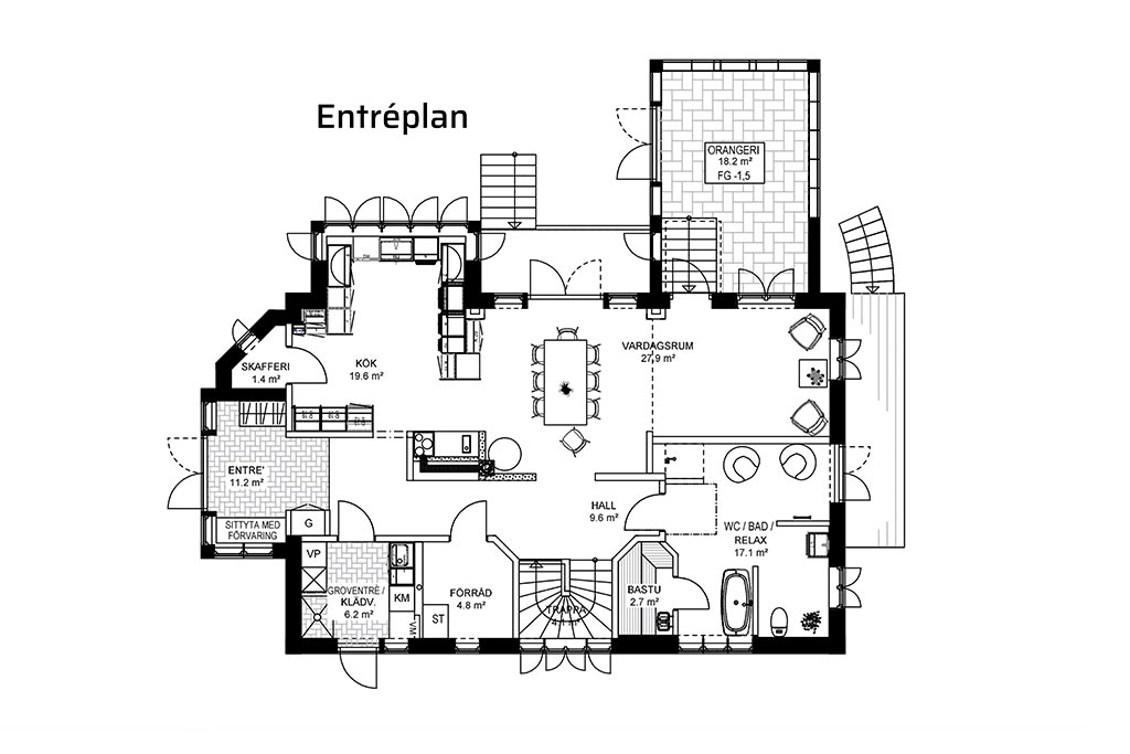 Entréplan i den stora villan är på 112 kvadratmeter. Innanför den rymliga hallen kommer kök, matplats och ett vardagsrum med utgång och en trappa ner till orangeriet som är placerat närmare vattnet. På denna våningen finns också en relaxavdelning med badkar och bastu, samt förråd. Självklart också ett skafferi som är placerat i vinkeln mellan hallen och köket, och som med sitt lilla fönster skapar en vacker utformning på husets fasad.