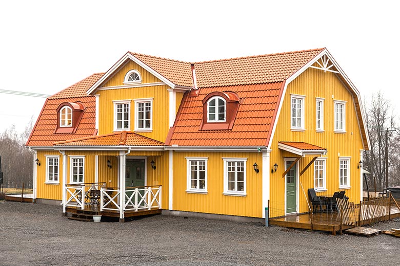 “Vi var i Alingsås Huspakets showroom ett par gånger. Det var bland annat bra att titta på olika fönstermodeller och spröjs. Först hade vi ritat huset med krysspröjs men sedan ändrade vi oss till raka spröjs eftersom vi ville ha dem utanpåliggande. Då räknades det som en ändring i bygglovet. Våra allmogelister valde vi också från Alingsås Huspaket. Vår golvsockel är 12 cm hög och det är inte standard, men de hjälpte oss att hitta en modell som vi gillade”, säger Elsa.