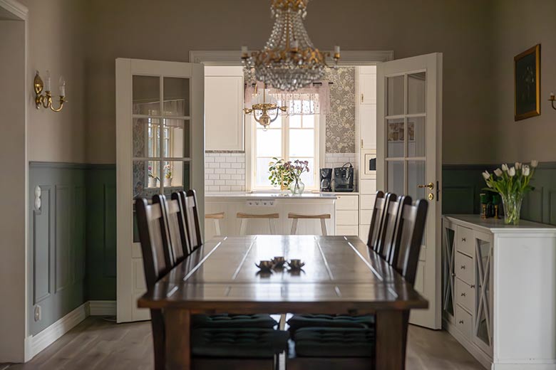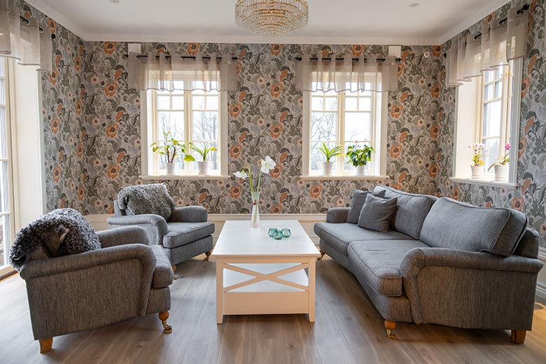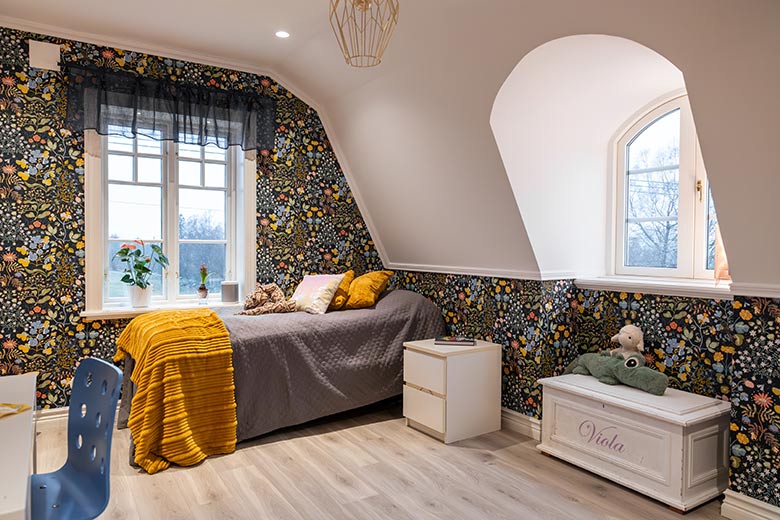 “På övervåningen har vi tagit hjälp av en inredningsarkitekt. Hon tog fram förslag på den mörkröda väggfärgen. Det var även hennes idé att välja en grön soffa. Utan henne hade jag aldrig vågat det men nu är jag väldigt nöjd. Jag älskar tapeter och har valt tapeter till nästan varje rum. De besluten fick Jonas hålla sig utanför”, säger Elsa och skrattar. Hon berättar också att de haft vitt på väggarna i sina tidigare hus, vilket de helt frångått här på Blomstergården. En av anledningarna till att Elsa valt att satsa på mer kulör här är att det känns mer ombonat och lättare att få det mysigt. Dessutom syns inte smutsen från hundarna lika tydligt heller.