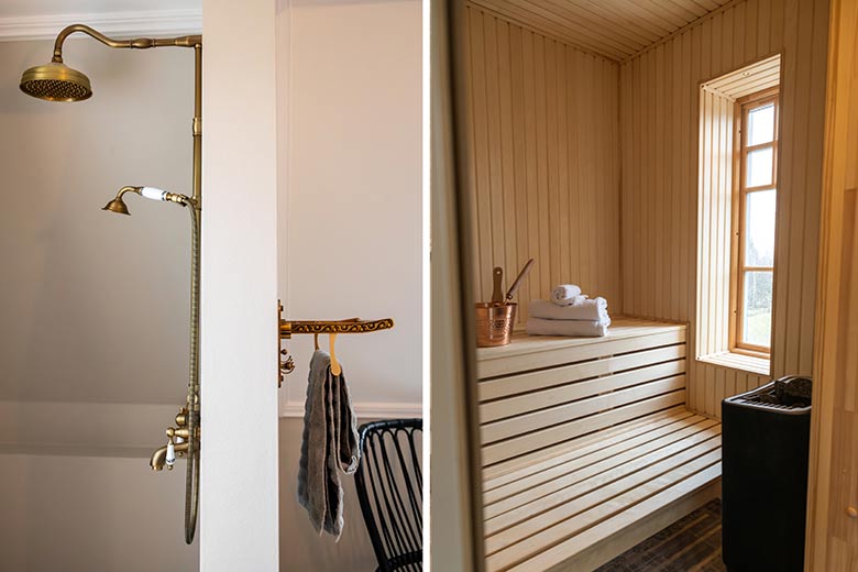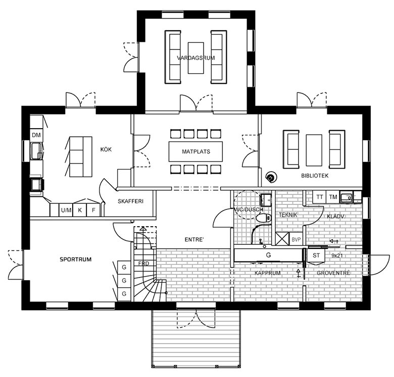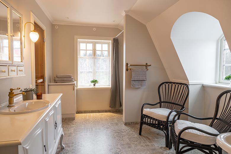 På nedervåningen har familjen skapat en smart och rymlig lösning för groventré och tvättstuga. Till höger om herrgårdens stora hall leder ett kapprum vidare till en groventré med gott om plats för ytterkläder. Därifrån når man tvättstugan som medvetet ligger avskilt placerad från groventrén. Innanför tvättstugan finns ett mindre förråd som också fungerar som teknikrum.