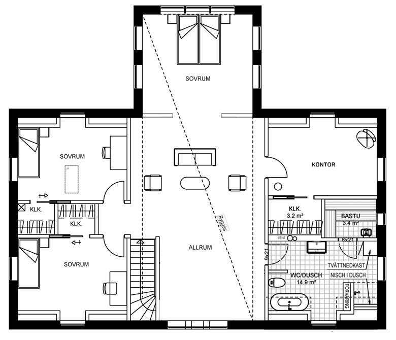 En fördel med att bygga i lösvirke är att man har möjlighet att göra justeringar under byggets gång. En sådan justering gjorde familjen Blomster när de färdigställde övervåningen. Under byggtiden såg de hur fint ljuset föll in i allrummet både från sydväst och från sovrummet i nordöst. I de ursprungliga ritningarna skulle det suttit en innervägg intill trappan som skulle utgjort ett kontor. Efter att ha känt in rummet under bygget valde familjen istället att låta planlösningen vara öppen för att behålla det vackra ljusinsläppet.