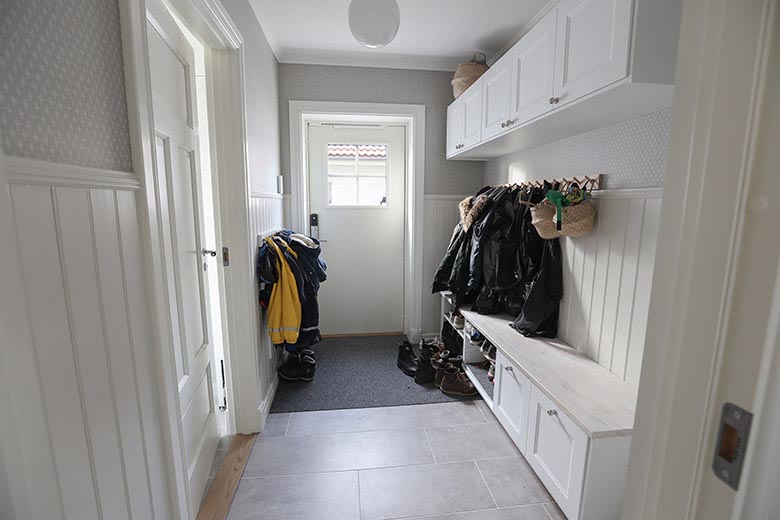Tvättstugan fick ett eget rum i anslutning till groventrén, som i sin tur fick större väggytor där jackor och skor kan förvaras. Detta ger bättre möjligheter att hålla ordning, något som underlättar vardagslivet när det finns två pigga barn i huset.