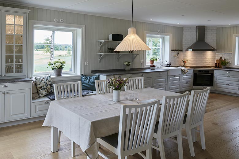 rymligt kök med sittbänk, vitrinskåp och fönster