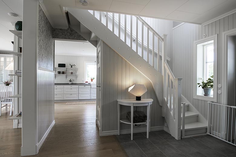 hall med sikt genom hela huset och praktisk förvaring under trappan
