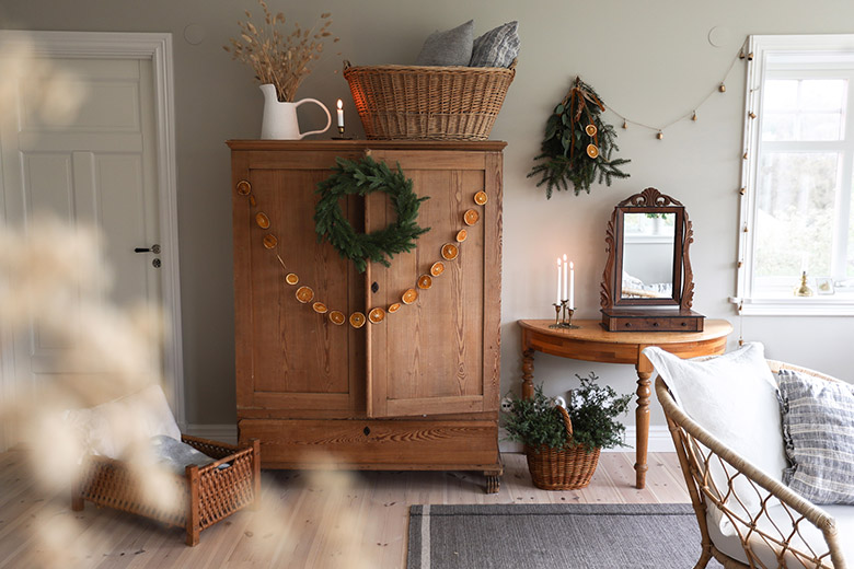 Ett band med små dekorationer på rad kan skapa underverk när det kommer till julpyntet. Girlanger finns i så många olika typer och det är enkelt att göra din egen. Allt du behöver är ett band eller snöre, och små dekorationer som kan återkomma på snöret. Till exempel små buntar med kvistar eller granris, vimplar i tyg eller torkade skivor av apelsiner som på bilden ovan.