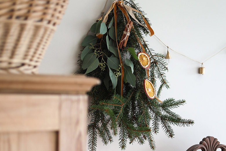 På bilden har Sarah dekorerat granriset med några kvistar eukalyptus, några torkade apelsinskivor, en kanelstång och ett vackert sammetsband som plockar upp färgen i kanelstången. Färger som brunt och orange är fint att dekorera med för att skapa julstämning, julen behöver inte alltid vara röd.