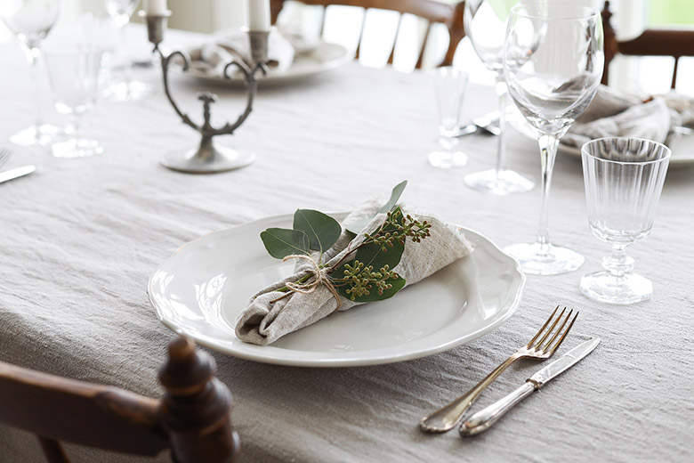 I bordsdukningen har Sarah valt att hålla sig till få färger och kombinerar linnefärgen på duken och servetterna tillsammans med det gröna i granriset och eukalyptusen. Servetterna hålls ihop av ett enkelt jutesnöre och som dekoration har eukalyptus, kanelstänger och stjärnanis stuckits ner, det behöver inte vara svårare än så.