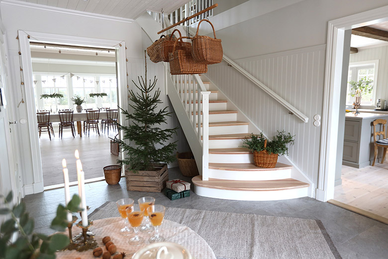 “I min hall har jag fyllt en korg med enris och jag fick dessutom plats med en liten gran jämte trappan. Paketen under granen är bara tomma lådor som jag klätt med tyg som blivit över från ett annat projekt, men de tillför ändå en viss spänning.” säger Sarah.