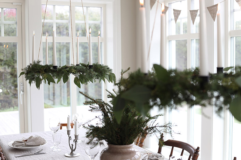 Ljuskronorna ovanför det stora bordet i matsalen har också dekorerats med ris, här har enris kombinerats med eukalyptus för att få en livfull struktur. Material från naturen och lite ståltråd är allt som behövs. Istället för ljuskronor går det lika bra att klä en slät ring av metall och hänga upp ovanför bordet för att tillföra julstämning på olika nivåer.