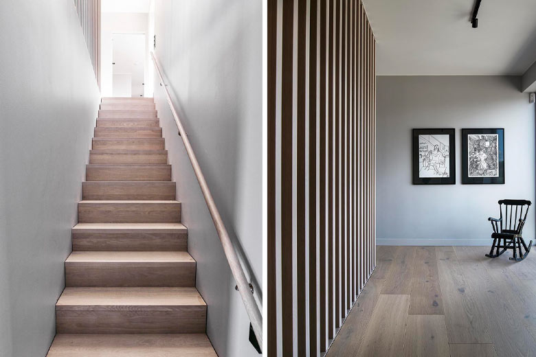 Även familjen Crozzoli har placerat sin trappa mellan två väggar. Den ena väggen följer med ända upp till taket medan den andra sidan övergår i en vacker spaljé när du kommit upp på övervåningen. Spaljén är ett effektfullt alternativ till ett traditionellt trappräcke och blir som ett konstverk som släpper ner ljuset i trappan. Denna häftiga spaljé var tvungen att planeras in i stommen för att kunna komma på plats i huset.