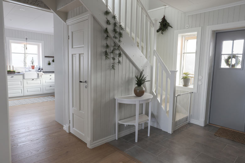 Familjen Stenseke i Vårgårda har utnyttjat utrymmet under trappan på ett sätt som både är praktiskt och snyggt. Trappan har en L-form som börjar i hallen och kommer upp i allrummet på övre plan. Planlösningen gör det möjligt att få plats med en dörr i full storlek under trappan, och tack vare det fina trappräcket skapas ett luftigt intryck trots den inbyggda förvaringen. Varenda detalj är genomtänkt och passar denna villa i sekelskiftesstil perfekt, ett riktigt snyggt förråd helt enkelt!
