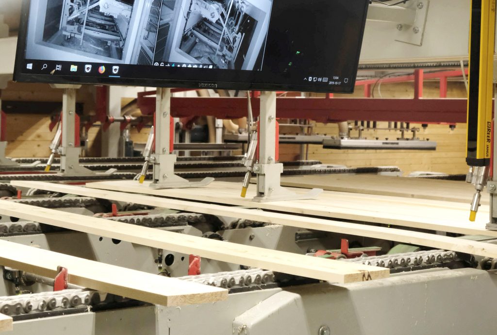 Vårt måleri är uppbyggt i linjer som är specialanpassade och effektiviserade efter just vår verksamhet. Det torra virket levereras direkt från vårt moderna hyvleri på andra sidan gården. Brädorna läggs i sektioner på valsar och rullas in genom de stora portarna till måleriet. Första steget i processen är en vakuumsug som förflyttar ett lager brädor åt gången och placerar dem på bandet.