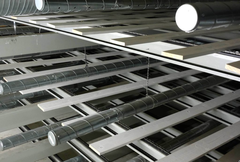 De nymålade brädorna fortsätter in i nästa hall för att färgen ska få torka. Hallen fungerar som ett extremt stort torkskåp med en temperatur på ca 45 grader. Här genom passerar virket långsamt med en konstant hastighet för att färgen ska torka jämnt. På 15 minuter är virket till ett helt hus målat, torrt och redo för ett till lager färg!