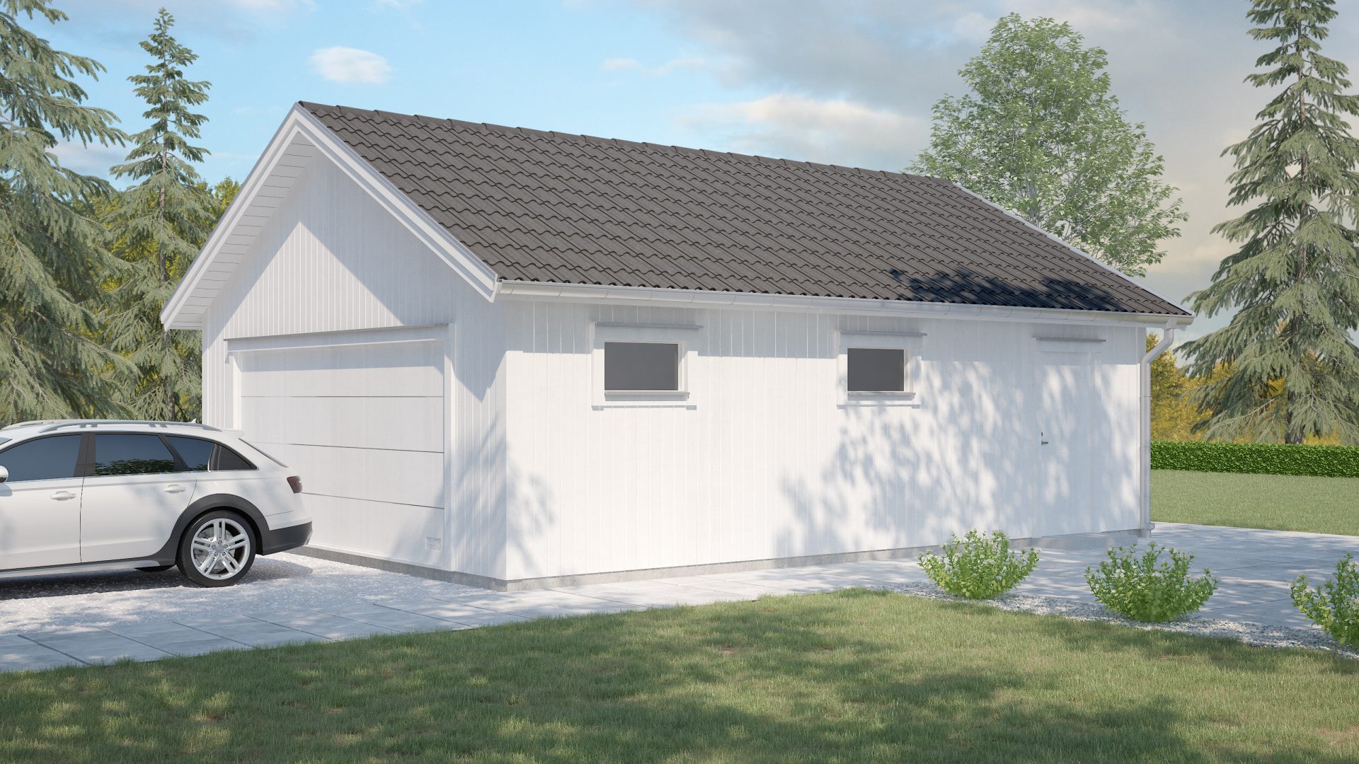 22mm obehandlad norrlandspanel/28x70mm spikregel/vindduk/45x145mm stomme (färdigkapad och urjackad) för garage och 45x95mm stomme för carport.