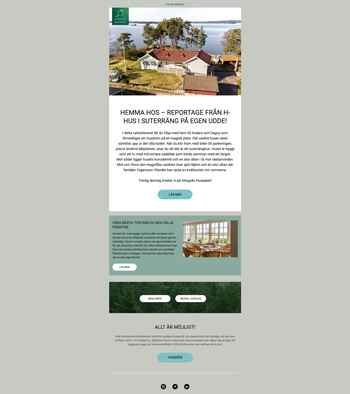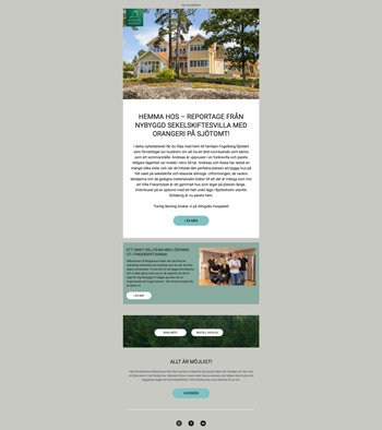 Vi vill gärna dela med oss av vår inspiration till dig och ditt hem. I vårt nyhetsbrev som kommer ut varannan månad får du bland annat följa med hem till familjer som byggt hus med oss och se hur de har gjort. Vi berättar också om trender, nyheter, och ger praktiska tips och råd om allt som rör hus, hem och trädgård. Allt är möjligt!