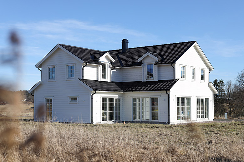 läs merKlassiskt trähus med amerikansk veranda på nybyggd hästgård